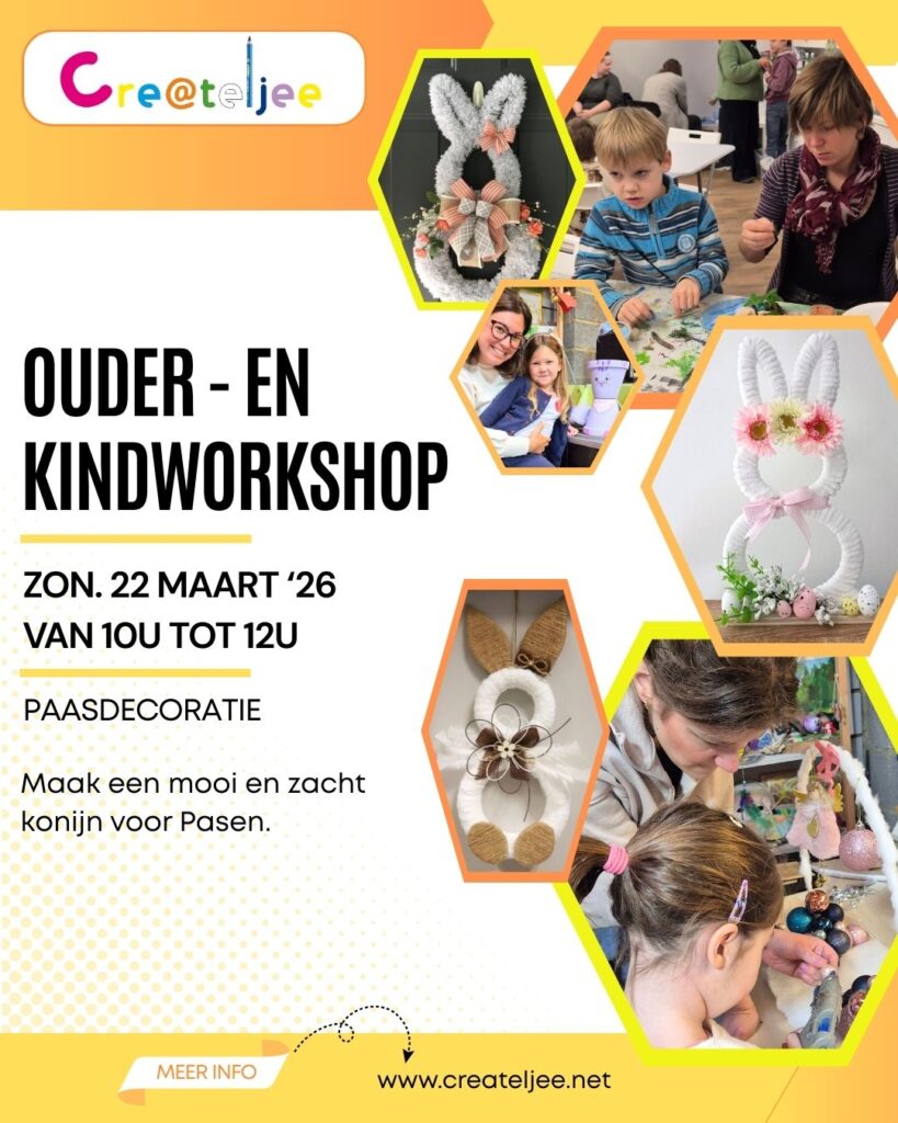 🎨 Ouder & Kind Workshop – Paasdecoratie maken 🌸🐰 Op zondag 22 maart 2026 (10u–12u) nodigt Cre@teljee je uit voor een gezellige en creatieve ouder-kind workshop in paassfeer! Samen maken jullie een unieke paasdecoratie in de vorm van een konijn. Een prachtig lente-item dat je kan ophangen of een mooi plekje kan geven op een […]
